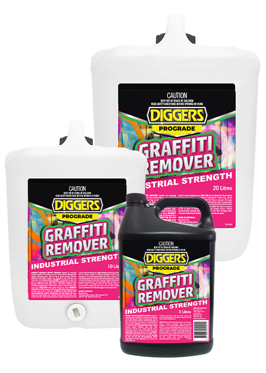 DIGGERS™ PROGRADE GRAFFITI REMOVER Industrial Strength is suitable for removing stubborn graffiti from almost any hard surface without damaging the original underlying paint.