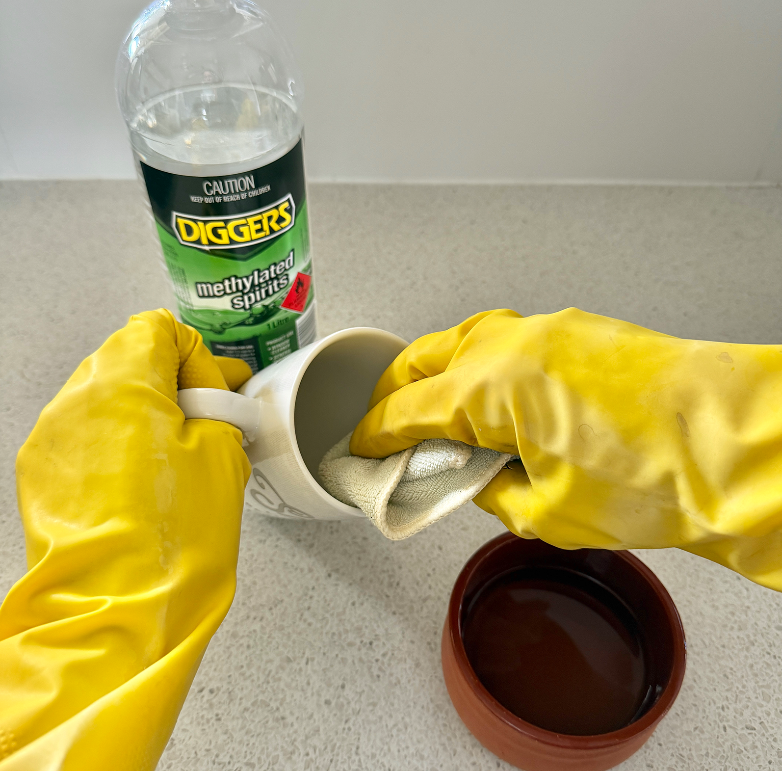 As a coffee lover, my favourite mugs become stained over time, making them look unsightly and dull. DIGGERS™ Methylated Spirits can remove these stains easily! I simply dab a small amount onto a cloth (never pour directly into the mug or cup), gently wipe over the stain until it’s gone, then rinse thoroughly with soapy water to ensure the mug is safe for drinking. I’ve successfully removed coffee, tea, and wine stains from glazed ceramic, porcelain, and glass mugs, saving time on scrubbing and cutting out the need for multiple products.